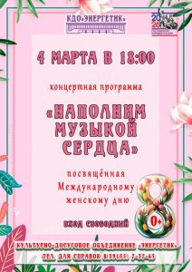 💐4 март в 18:00 Культурно-досуговое объединение «Энергетик» состоится концертная программа «Наполним музыкой сердца», посвященный Международному женскому дню!