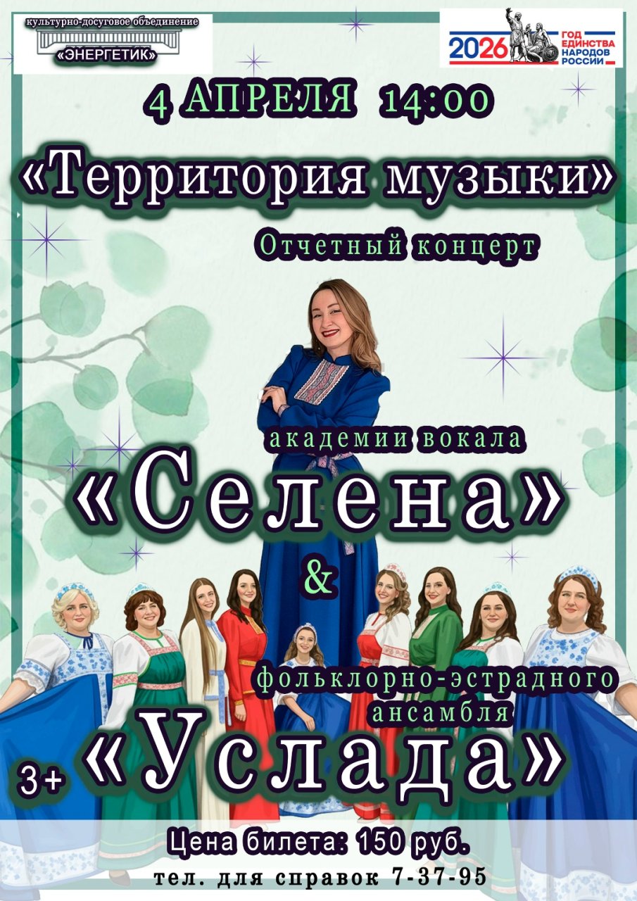 💥4 апреля, в 14:00, в стенах культурно-досугового объединения «Энергетик» состоится знаменательное событие – отчетный концерт двух талантливых коллективов: академии вокала «Селена» и фольклорно-эстрадного ансамбля «Услада», объединенных под чутким руководством Анны Викторовны Наумовой.
